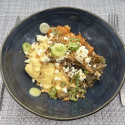 VG : Polenta crémeuse, fricassée de légumes, féta, oignons frits et nouveaux