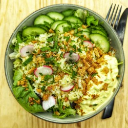 Salade Hakuna Raïtata : Raïta de crevettes (sauce curry crème/yaourt, coriandre, menthe crevettes, épices indiennes), Riz, concombre, radis, oignons frit, salade