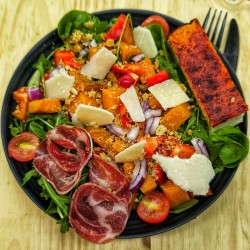 Coppa, oignons rouge, crumble parmesan, poivrons, focaccia poivronnade, patates douces, tomate, roquette