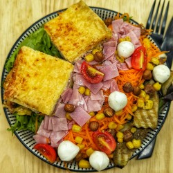 Salade Dundee : Croque-monsieur ( crème fraiche, emmental, œuf ), jambon blanc, mozzarella, aubergine grillée, maïs, carottes, tomate, salade, noisettes.