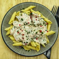 Salade Poulet, fêta, pâtes à la poivronnade, légumes croquants( carottes, concombre, oignons rouges, poivrons) menthe