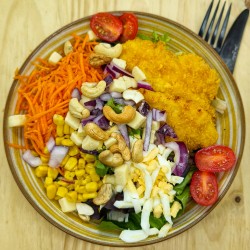 Salade Picote : poulet pané, gruyere, carotte rapée, tomate cerise, mais, oeuf, oignon rouge et noix de cajou, salade