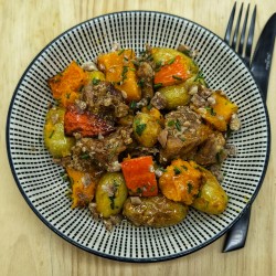 Sauté de porc mariné au sirop d'érable, gingembre, soja, légumes d'automnes rôtis (butternut, potimarron, grenailles et châtaignes)