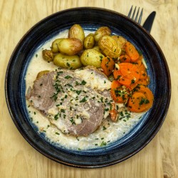 Rôti de porc cuit au lait (recette de papa) pomme de terre grenaille, carotte vichy a la persillade