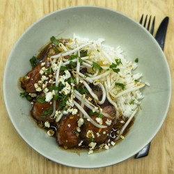 Magret de canard a la pekinoise*, riz, crumble de pop corn, pousse de soja, coriandre et cebettes