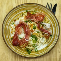 Gratin de pâtes à l'auvergnat : Pâtes, lard, oignon confit, persil, noisette, crème, tomme fraiche