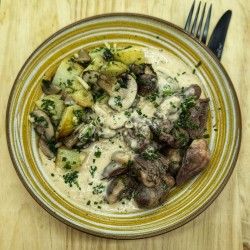 Coeurs de canard à la persillade, sauce aux poivres, poêlée de pomme de terre et champignons