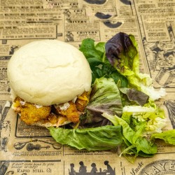 poulet pané, coleslaw, pickles, mayo wasabi, oignons frit, cheddar