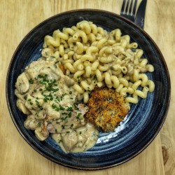 "Salade Angry Chicken Salade, poulet mariné à la tomatade, feta, basilic, pâtes tomatade, tomates rôties, poivrons, roquette, noisettes, oignons nouveaux, noisettes"