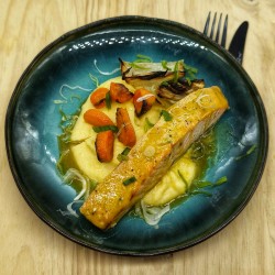 "Poke bowl : Saumon fumé, Riz vinaigré, fèves, avocat, mangue, noix de Cajou, crème Wasabi légère, oignons frits, sésame noirs et dosette de soja salé