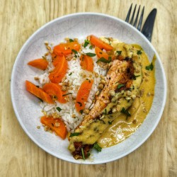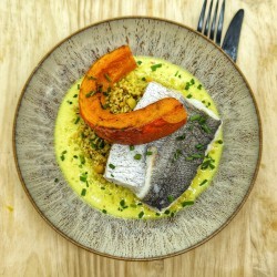 Dos de merlu, crème de curry, céréales asiatiques, potimarron rôti, ciboulette