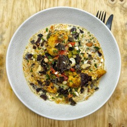 Tom Yum de poulet ,Bouillon thaï, vermicelles de riz, lait de coco, cajou, poulet, légumes (champignons chinois, pak choï, poivron rouge) basilic thaÏ