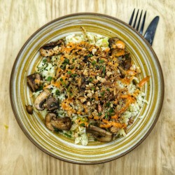 Poulet pané maison, riz aux pak choï, amandes, curry, ciboulette, cheddar, champignons grillés au soja, mayonnaise sriracha, sésame, cacahuètes, oignon frit