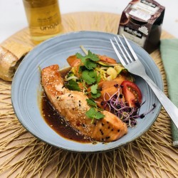 Pavé de saumon teriyaki aux 2 sésames, nouilles chinoises et wok de légumes croquants