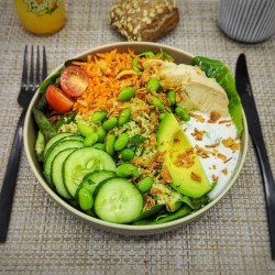 MARINETTE / Salade poulet mariné à l'ail et au citron, crème aux herbes, avocat, concombre, carotte râpées, fèves, oignons rouges et frits, boulgour