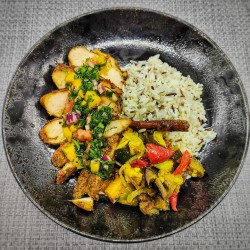 Suprême de poulet mariné Berbère grillé, riz sauvage, sauce chien aux fruits exotiques (mangue passion, zeste de combawa) légumes confits au ras el hanout et citron confit