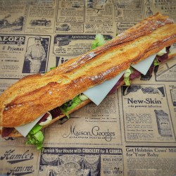 Pain baguette, poulet, parmesan, mayonnaise, tomate, roquette.