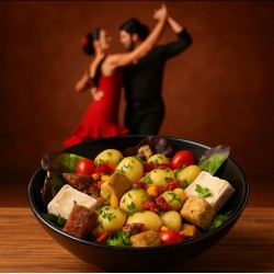 Salade chorizo grillé pommes terre grenailles croûtons maïs salade tomates persil chèvre