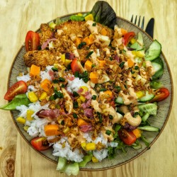 Salade Chicken Bowl : Poulet pané au panko, cube de mimolette et emmental, bacon crispy, sauce bacon fumé, maïs, tomate cerise, concombre, oignons frits, ciboulette, riz vinaigré et salade