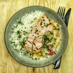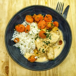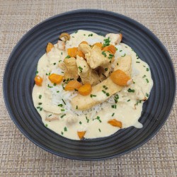 Tarte au poulet curry, oignons confits, crème moutarde, cheddar