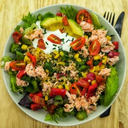 Emietté de saumon, crème citronnée, avocat, boulgour, maïs, pIquillos, tomates confites, salade