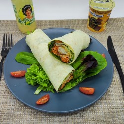 poulet pané, salade, sauce taco, comté râpé, oignons rouge, tomate confites