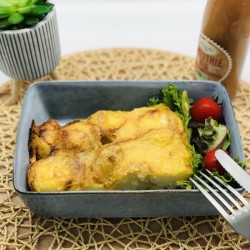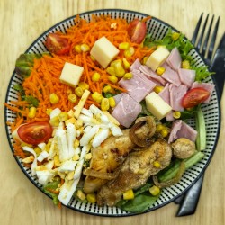 Salade, jambon, poulet mariné aux oignons caramélisés, miel, balsamique, emmental, maïs, carottes râpée, carottes, oeuf, tomates