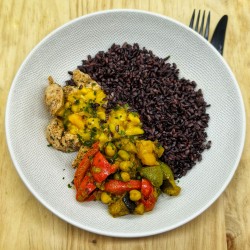 Suprême de poulet mariné Berbère grillé, riz sauvage, sauce chien aux fruits exotiques (mangue passion, zeste de combawa) légumes confits au ras el hanout et citron confit