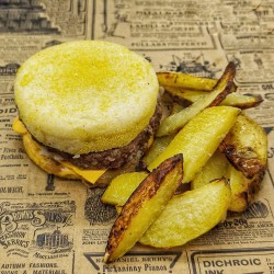Pain muffin toasté, steak haché, cheddar, oignon confit, tomate, sauce Classic