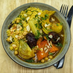 *semoule, pois chiche, raisin sec, fenouil, potimarron, chou blanc, navet, dattes, olive verte, amandes
