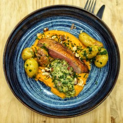 Magret de canard sauce chimichurri, mousseline de légumes*, pommes de terre grenaille, noisette