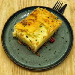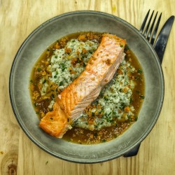 Dos de merlu chimichurri, purée de pomme de terre et courgette au Boursin, crumble de parmesan