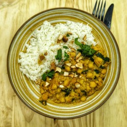 mijoté de pois chiche et lentilles corail aux épices Indienne ,tomate ,lait de coco ,pousse d'épinards ,noix de cajou ,coriandre et riz