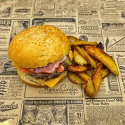 Pain burger, steak haché black angus, bacon, cheddar, sauce au poivre vert, oignons rouges, tomates, pickles et potatoes maison