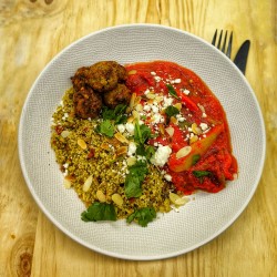 VG : Chakchouka, falafel, céréales méditerranéennes, féta, amandes effilées, coriandre