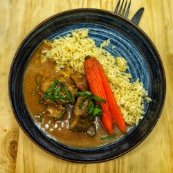 Emincé de bœuf, sauce bordelaise*, pomme de terre grenaille et haricot vert