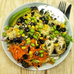 Poulet mariné, crème aux herbes et ail, avocat, carottes râpées, olives, maïs, céréales Méditerranéenne, fèves, oignons rouges et graines, salade"