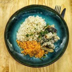 Le Plat vapeur : Lieu noir poché au lait de coco* riz rouge de Camargue Bio*