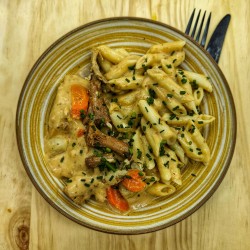 VG: Courgettes et champignons à la persillade, coquillettes, pignons de pin, cheddar râpé, persil