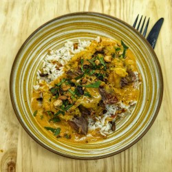 Lieu noir en panure panko*, riz, crémeux patate douce, quartier de citron vert