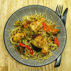 Sauté de poulet à l'asiatique, citronnelle, légumes sautés, champignons, cacahuètes et nouilles...