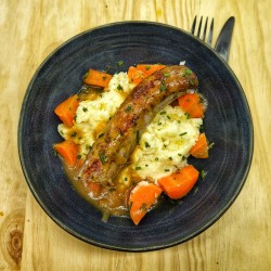 Saucisse Brasse confite et son jus purée de pommes de terres et carottes vichy a la persillade