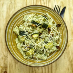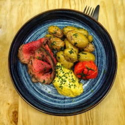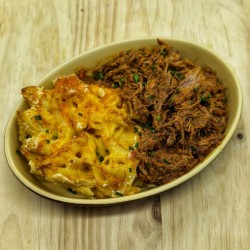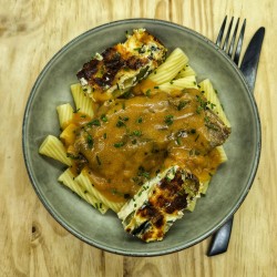 Pluma iberique, jus de cochon crémeux au citron et estragon, gratin de courgette, rigatoni