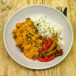 Byriani de poulet aux poires et amandes, riz, wok de poivrons et carottes, coriandre, citron vert