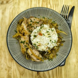 *Jambalaya from Louisiane : crevettes, poulet, saucisse fumée, poivrons, cajun, aneth, citron, riz