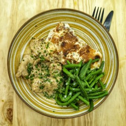 Mijoté de lapin à la créme de moutarde de Meaux*, haricots vers persillés et gratin dauphinois