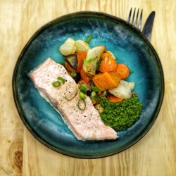 Merlu, crème verte, jardinière de légumes, riz sauvage