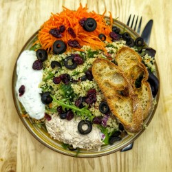 Salade, rillette de thon (mayonnaise), taboulé (tomates, concombre, persil, menthe, citron), cranberries, carottes râpées, roquette, crème aux herbes, olives grecque et tartine de pain grillé