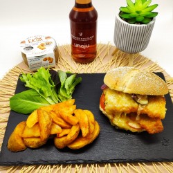 Burger Fish & Chips : Pain burger, Fish and Chips, sauce Tartare, Oignons rouges, Pickles, Tomates, Fromage, potatoes maisons
