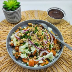Salade Poulet, fêta, pâtes à la poivronnade, légumes croquants( carottes, concombre, oignons rouges, poivrons) menthe